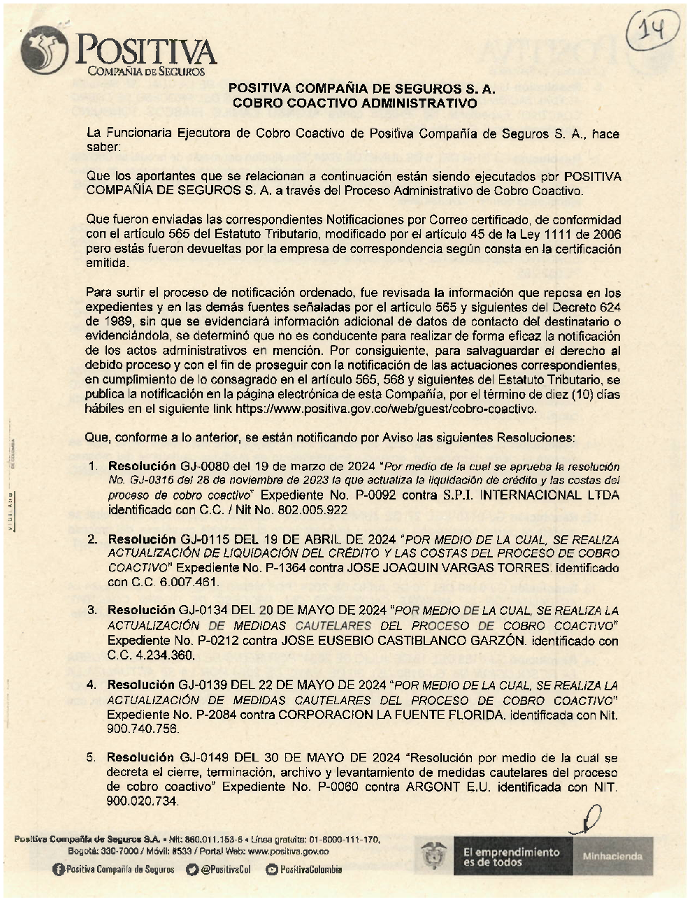 Si culminó la etapa de notificaciones por correo certificado de las actuaciones, pero estás fueron devueltas por la empresa de correspondencia podrás encontrarlas a continuación, esto con el fin de surtir el proceso de notificación ordenado y el derecho al debido proceso para continuar con la notificación de las actuaciones correspondientes en cumplimiento de lo consagrado en los artículos 565, 568 y siguientes del Decreto 624 de 1989 (Estatuto Tributario). Se publica la notificación en la página electrónica de Positiva Compañía de Seguros, por el término de diez (10) días hábiles.