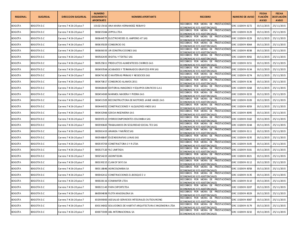 A continuación encontrarás la relación de avisos (edictos), proyectados hasta la fecha en procesos pre jurídicos de cobro adelantados por concepto de aportes en mora; también en procesos de recobros de prestaciones económicas y/o asistenciales por mora a la fecha del evento o inconsistencias administrativas.