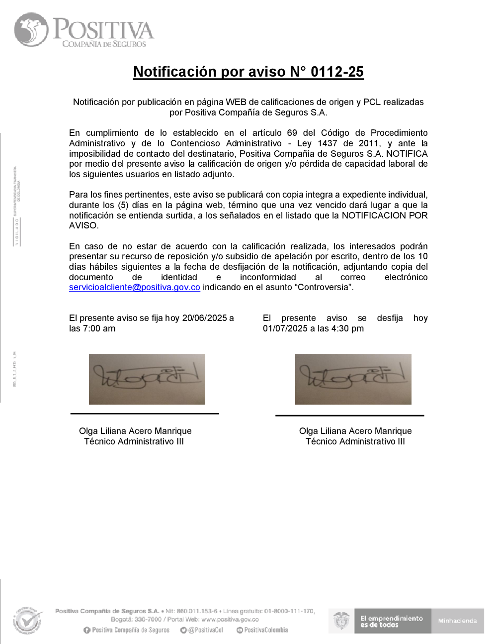 De conformidad con lo establecido en artículo 69 ley 1437 de 2011 Código de procedimiento administrativo y de lo contencioso administrativo (CPACA), Positiva Compañía de Seguros publica en este espacio las citaciones para notificación personal, notificaciones por aviso y publicidad y notificaciones a terceros, a que se refieren los artículos 69 y 73 de la mencionada Ley.