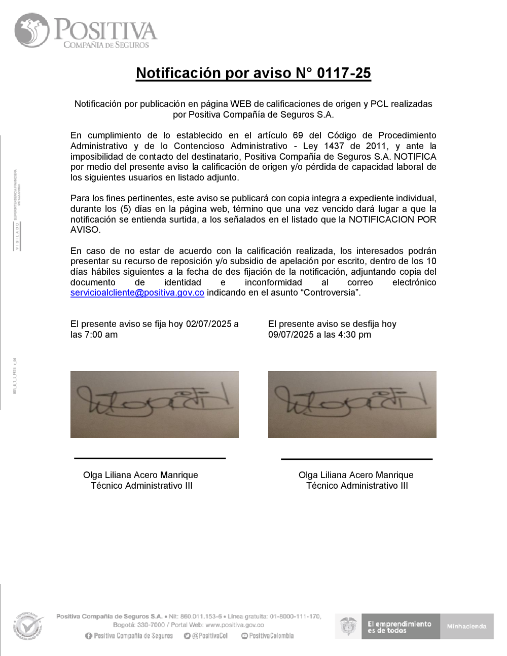 De conformidad con lo establecido en artículo 69 ley 1437 de 2011 Código de procedimiento administrativo y de lo contencioso administrativo (CPACA), Positiva Compañía de Seguros publica en este espacio las citaciones para notificación personal, notificaciones por aviso y publicidad y notificaciones a terceros, a que se refieren los artículos 69 y 73 de la mencionada Ley.