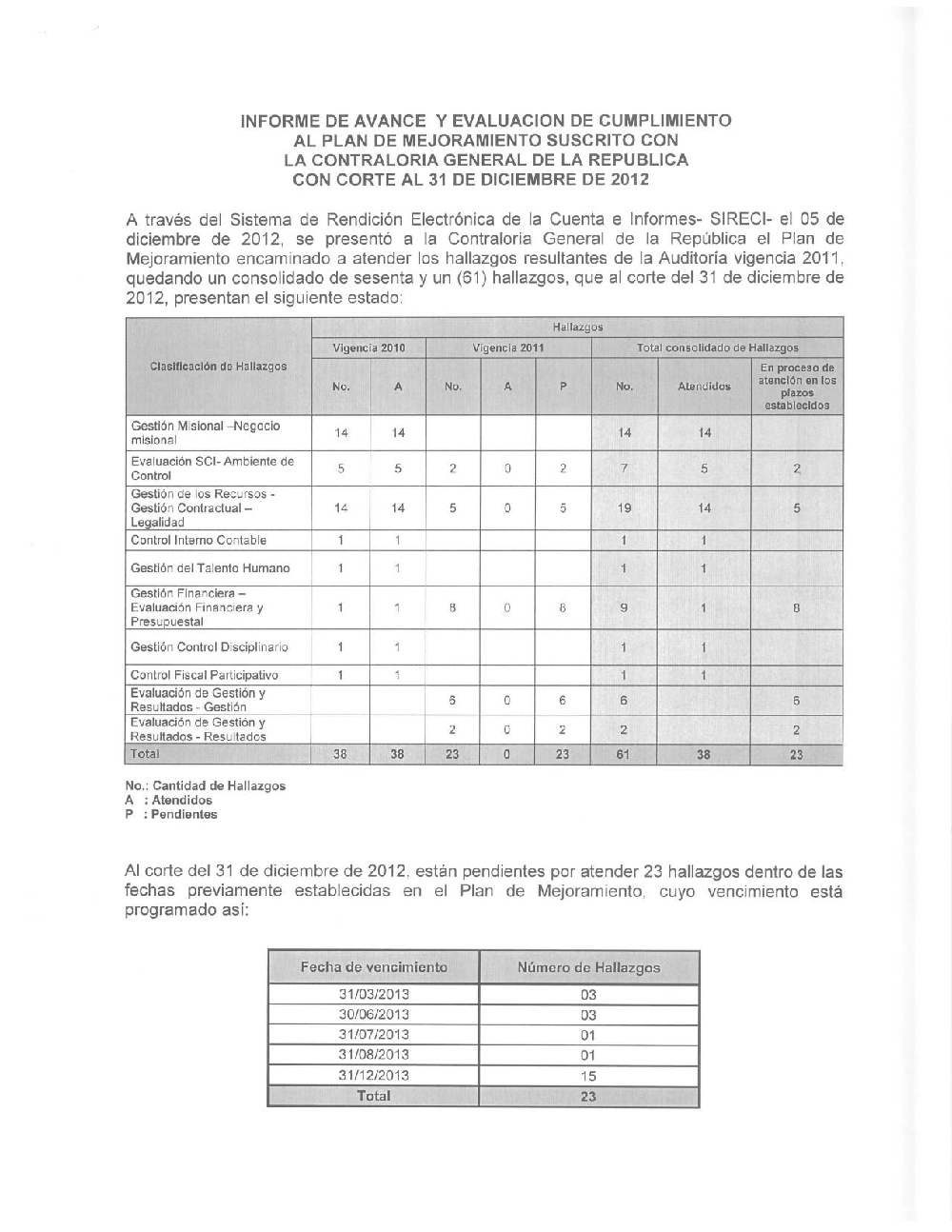 En esta sección podrás encontrar las evidencias de los diferentes planes de mejora, dando cumplimiento a las directivas presidenciales 08 de 2003 y 03 del 3 de abril de 2012 y circular externa 08 del 01 marzo 2012 del Ministerios de Hacienda y crédito público, se procede a la publicación del informe del avance al plan de mejoramiento suscrito con la Contraloría General de la República.