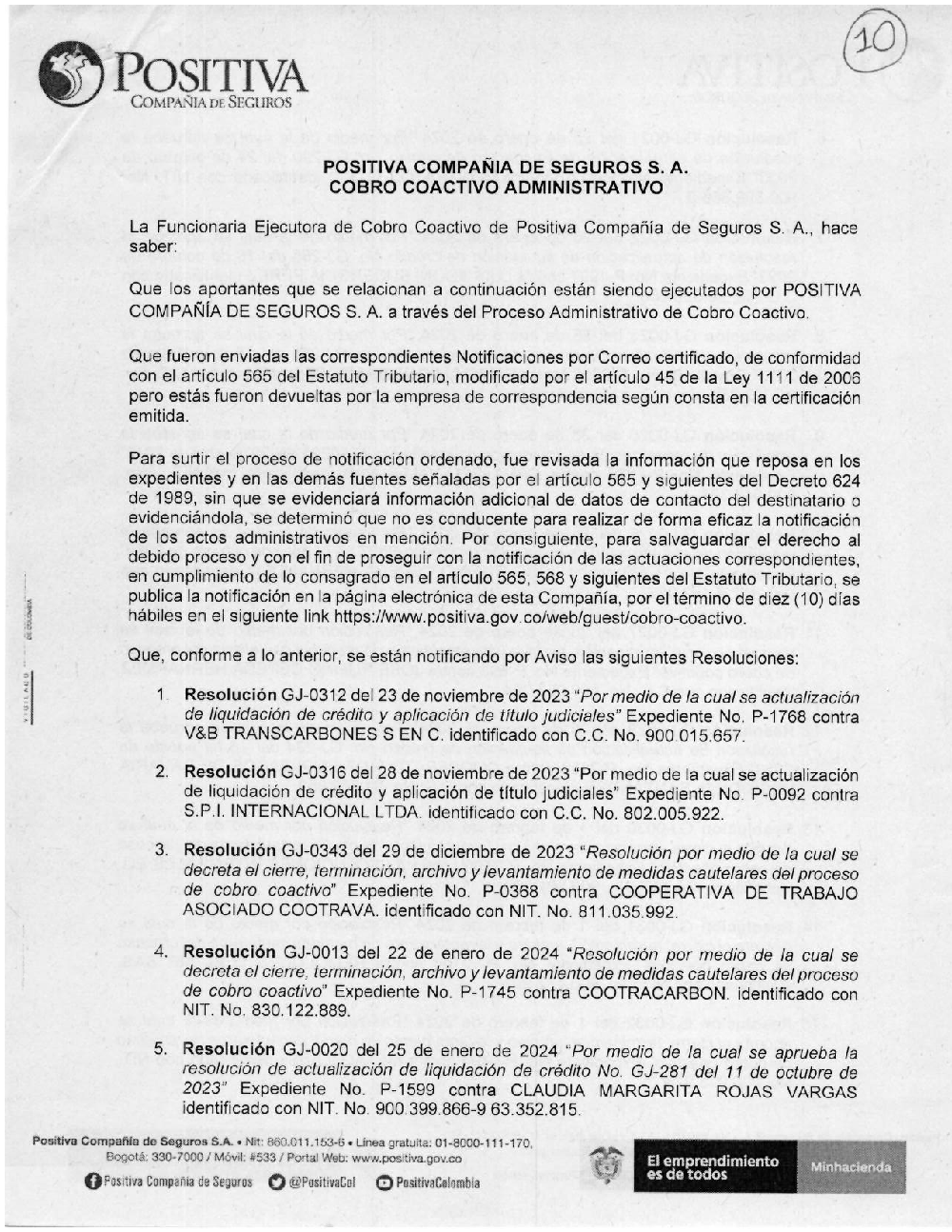 Si culminó la etapa de notificaciones por correo certificado de las actuaciones, pero estás fueron devueltas por la empresa de correspondencia podrás encontrarlas a continuación, esto con el fin de surtir el proceso de notificación ordenado y el derecho al debido proceso para continuar con la notificación de las actuaciones correspondientes en cumplimiento de lo consagrado en los artículos 565, 568 y siguientes del Decreto 624 de 1989 (Estatuto Tributario). Se publica la notificación en la página electrónica de Positiva Compañía de Seguros, por el término de diez (10) días hábiles.