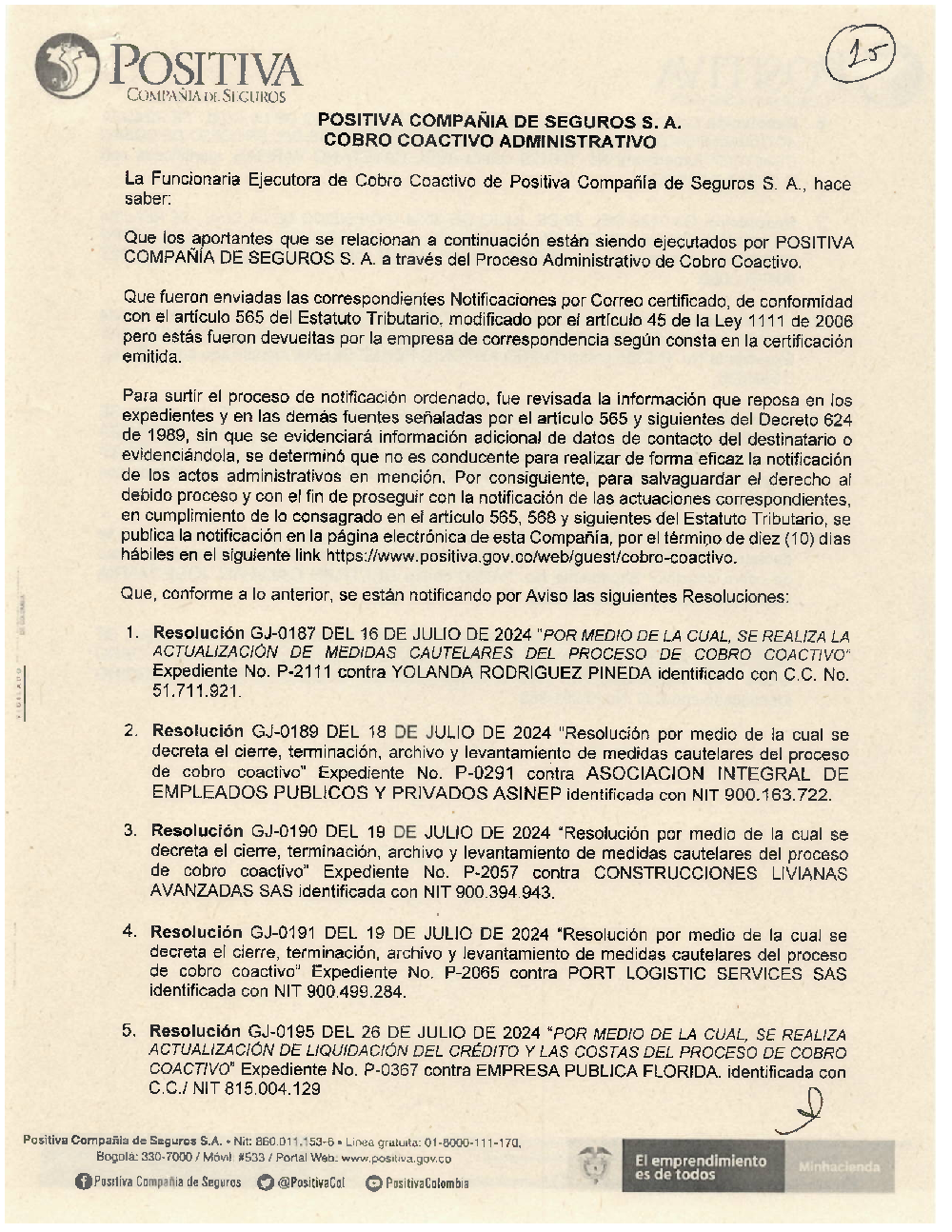 Si culminó la etapa de notificaciones por correo certificado de las actuaciones, pero estás fueron devueltas por la empresa de correspondencia podrás encontrarlas a continuación, esto con el fin de surtir el proceso de notificación ordenado y el derecho al debido proceso para continuar con la notificación de las actuaciones correspondientes en cumplimiento de lo consagrado en los artículos 565, 568 y siguientes del Decreto 624 de 1989 (Estatuto Tributario). Se publica la notificación en la página electrónica de Positiva Compañía de Seguros, por el término de diez (10) días hábiles.
