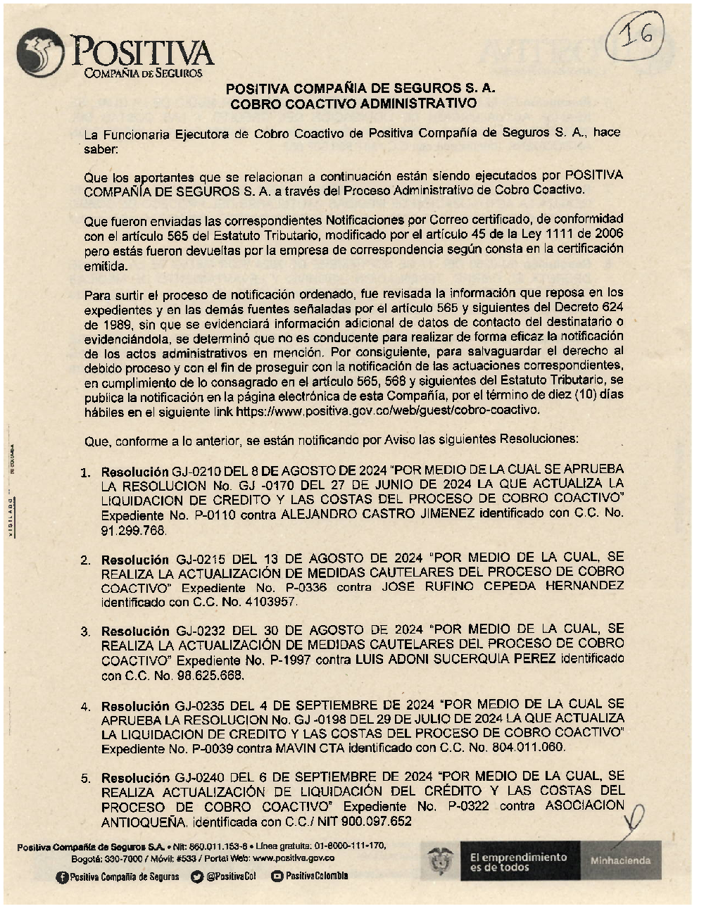 Si culminó la etapa de notificaciones por correo certificado de las actuaciones, pero estás fueron devueltas por la empresa de correspondencia podrás encontrarlas a continuación, esto con el fin de surtir el proceso de notificación ordenado y el derecho al debido proceso para continuar con la notificación de las actuaciones correspondientes en cumplimiento de lo consagrado en los artículos 565, 568 y siguientes del Decreto 624 de 1989 (Estatuto Tributario). Se publica la notificación en la página electrónica de Positiva Compañía de Seguros, por el término de diez (10) días hábiles.