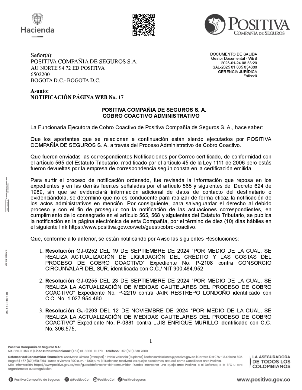 Si culminó la etapa de notificaciones por correo certificado de las actuaciones, pero estás fueron devueltas por la empresa de correspondencia podrás encontrarlas a continuación, esto con el fin de surtir el proceso de notificación ordenado y el derecho al debido proceso para continuar con la notificación de las actuaciones correspondientes en cumplimiento de lo consagrado en los artículos 565, 568 y siguientes del Decreto 624 de 1989 (Estatuto Tributario). Se publica la notificación en la página electrónica de Positiva Compañía de Seguros, por el término de diez (10) días hábiles.